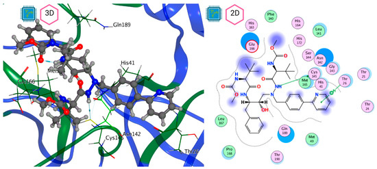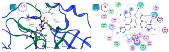 Mpro–LQM 778 complex active site. The direct protein–ligand interactions are represented in the dotted line. Three-dimensional (left) and two-dimensional (right) representations.
