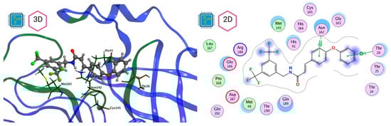 In Table 2, the residues defined by ProteinsPlus (DrugScore), which match with the SiteFinder process, are presented. These residues are the most likely to interact with molecules from the database and will be used in molecular docking. These residues are visualized in Figure 5 and play a crucial role in molecular docking processes. Some of the amino acids in the Mpro protein have already been identified as relevant in the literature. These are the His41 and Cys145 residues, which, as mentioned above, form a catalytic dyad and can inhibit protein activity [22]. Given the presence of these two residues, they prove to be a crucial part of inhibitor design [44].