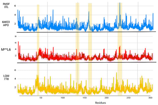 The results obtained after calculations reveal that the two systems with ligands have a lower fluctuation in the RMSD values. It is observed that the system in its apo-form reaches a maximum distance of 3.5 Å, in contrast to the system with the MproL6 ligand, which reaches a maximum distance of 3.1 Å. Finally, the system with the LQM 778 ligand has a maximum distance of 2.3 Å, suggesting that the complexes are more stable. Both ligands could maintain protein stability once they bind to the pocket.