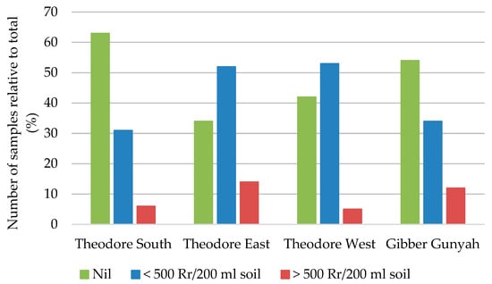 Figure 1 depicts the number of samples (each from 10 ha field sections) associated with nil detections and three broad density categories (<500, 500–1000, and >1000 nematodes/200 mL soil) for the four production areas in the Dawson-Callide region. These density divisions were used to convey some range of the nematode densities measured and are not associated with a particular level of crop damage, as this is not yet understood for the Australian cotton farming system. Internationally, it has been estimated that the economic damage threshold (number of nematodes required to cause a 10% or greater yield loss) is 1000 reniform nematodes/200 mL of a clay loam soil for samples collected post-harvest []. Hence, for comparison, the percentage of samples exceeding 1000 nematodes per 200 mL of soil was included.