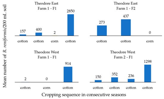 The population densities observed after each rotation cycle behaved as expected based on the known host suitability of the different crops (Figure 2 and Figure 3). The mean reniform nematode population densities in soil post-harvest were lowest when corn was included in the cropping sequence, reducing the populations from 400 to 2 and 437 to 0, in fields 1 and 2 on Farm 1 Theodore East, respectively (Figure 2). Soil populations of reniform nematode increased following continuous cotton (Figure 3). The highest soil population of 2850 R. reniformis/200 mL of soil was observed in post-harvest cotton, even though the mean soil population of the previous corn crop post-harvest was only 2 R. reniformis/200 mL of soil (Theodore East Farm 1—F1). This trend was also observed in a second field (Theodore West Farm 1—F1), where no reniform nematodes were detected after corn in the top 15 cm of soil; however, when planted to cotton in the following season, the post-harvest soil population increased to 914 R. reniformis/200 mL of soil (Figure 2).