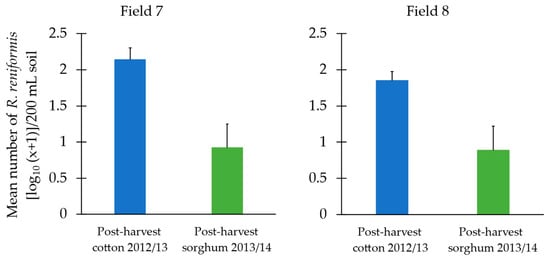 The mean population of Rotylenchulus reniformis [log10(x + 1)] per 200 mL of soil in the top 15 cm post-harvest following cotton in 2013 and sorghum in 2014 in fields 7 and 8 on a commercial cotton farm in Emerald, Queensland. Error bars represent the standard error of the mean (n = 6 for field 7, n = 4 for field 8).