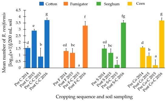 The effect of cotton and non-host summer crops on density of Rotylenchulus reniformis [log10(x + 1)] per 200 mL of soil in the top 15 cm pre-plant and post-harvest of crop. Pre = Soil sampling pre-planting of crop; Post = Soil sampling post-harvest of crop. C = cotton, F = biofumigation sorghum ‘Fumig8tor’, S = sorghum (grain), Co = corn. Cropping cycle over two seasons: C-C = cotton-cotton, F-C = biofumigation sorghum ‘Fumig8tor’-cotton, S-C = sorghum (grain)-cotton, Co-C = corn-cotton. Error bars represent the standard deviation of the mean (n = 6), and treatments followed by a different letter are significantly different from one another (p < 0.001).