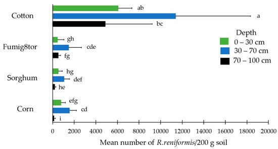 In 2015 post-harvest, the Crop × Depth interaction effect was significant for mean population density of reniform nematode in the soil (Figure 6). The reniform nematode was found at very high densities at all sampling depths when cotton was grown. The highest average population under cotton was 11,399 R. reniformis/200 g of soil at a depth of 30–70 cm, which was significantly higher than the population at 70–100 cm (4872 R. reniformis/200 g of soil). There was no significant difference between the population in the top 30 cm (6060 R. reniformis/200 g of soil) compared to 30–70 cm.