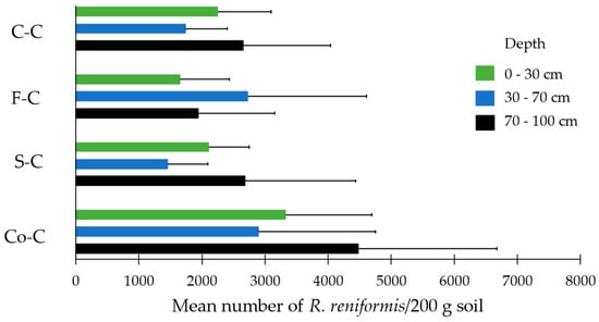 Mean reniform nematode densities (Rotylenchulus reniformis/200 g of soil) at three sampling depths for four cropping sequences post-harvest. Cropping cycle over two seasons: C-C = cotton-cotton, F-C = ‘Fumig8tor’-cotton, S-C = sorghum-cotton, Co-C = corn-cotton. Error bars represent the standard deviation of the mean (n = 6). The figure represents raw data, but the statistical comparisons are based on the transformed data [√X]. Treatments (Crop × Depth) were not statistically different from one another (p ≤ 0.05).
