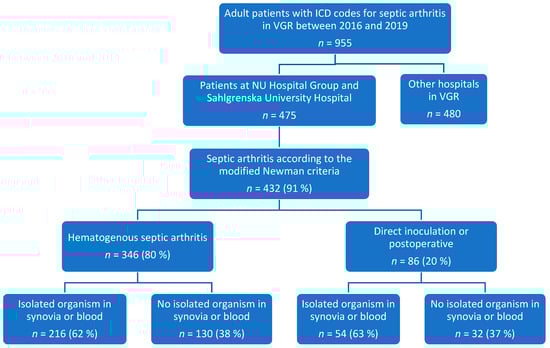 Of the 955 patients with an ICD-10 code for septic arthritis, we further investigated patients treated at two different hospitals in the region. We included one representative hospital from each category: NÄL-Uddevalla Hospital Group (NU) in Trollhättan and Uddevalla (county hospital), as well as Sahlgrenska University Hospital (SU) in Gothenburg to ensure consistency between university and county hospitals. Four hundred and seventy-five patients were treated for septic arthritis in these two hospitals during the study period from January 2016 to December 2019.