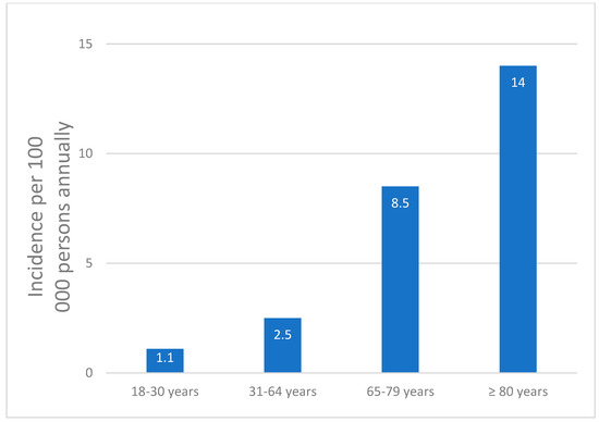 In the age group 18–30 years with a population of 1.174762 million, 51 patients were diagnosed, resulting in an incidence of 1.1 per 100,000 persons annually. In the age group 31–64 years, with a population of 2.890925 million, 292 patients were diagnosed, leading to an incidence of 2.5 per 100,000 persons annually. In the age group 65–79 years with a population of 0.972398 million, 333 patients were diagnosed, resulting in the calculated incidence of 8.5 per 100,000 persons annually. In the age group over 80 years with a population of 0.343774 million, 193 patients were diagnosed, resulting in a calculated incidence of 14 per 100,000 persons annually. The incidence in the age group over 80 was nearly 13 times higher than in the age group 18–30 years (Figure 2).
