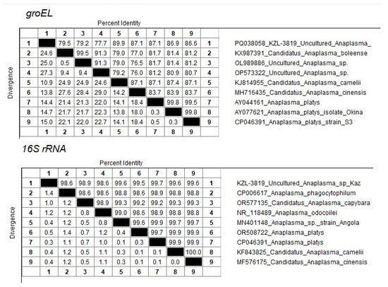 - Caudill, M.T.; Brayton, K.A. The Use and Limitations of the 16S rRNA Sequence for Species Classification of Anaplasma Samples. Microorganisms 2022, 10, 605. [Google Scholar] [CrossRef]
