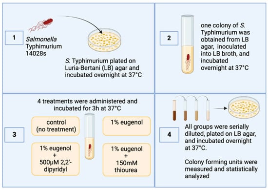 Salmonella Typhimurium strain 14028s obtained from ATCC (Manassas, VA, USA) and used in this study was streaked on Luria–Bertani (LB) agar (Fisher Scientific; Waltham, MA, USA) plates and incubated aerobically overnight at 37 °C. The following day, a single colony was picked, inoculated in LB, and incubated at the same atmosphere and temperature. The next day, the culture was reinoculated in new LB broth until it reached an optical density of 0.6 at 600 nm (4.8 × 108 CFU/mL). The culture was subsequently separated into four groups: a control group (no treatment) and three different treatment groups with 4 replications per treatment. The first treatment group consisted of cell cultures treated with 1% eugenol (Thermo Fisher Scientific, Waltham, MA, USA). In the second group, 150 mM thiourea (VWR Chemicals, Sanborn, NY, USA) was added along with 1% eugenol. In the third group, 500 µM Dip (2,2 dipyridyl; VWR Chemicals) was added along with 1% eugenol.