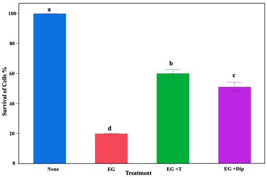 Effect of different treatments on Salmonella growth. The bar graph shows inhibitory effects of different treatments on controlling Salmonella Typhimurium abundance. The no-treatment group was used as a control (None). The treatment groups included cultures treated with 1% eugenol (EG), 1% eugenol + 150 mM thiourea (EG + T), and 1% eugenol + 2,2′dipyridyl (EG + Dip). Letters a–d denote significant differences.