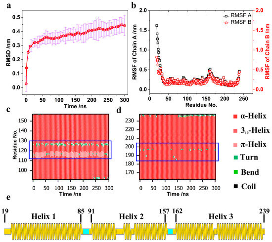 (a) Root Mean Square Deviation (RMSD) averaged over 10 trajectories. (b) Root Mean Square Fluctuation (RMSF). (c) Secondary structure analysis of Helix 2 in the 4ATM BAR monomer. (d) Secondary structure analysis of Helix 3 in the 4ATM BAR monomer. (e) Secondary structure segmentation of the 4ATM BAR monomer.