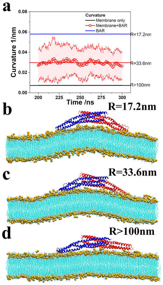 Curvature of the membrane and 4ATM BAR dimer. (a). Red line and dots with error band: Curvature of the membrane with the 4ATM BAR over time. The results are the average of 10 trajectories. Black line: Curvature of the membrane without the 4ATM BAR. The curvature is the average of 300 ns simulations. Blue line: Curvature of the 4ATM BAR crystal for RCSB. (b–d): Curved membrane with the 4ATM BAR showing the fitting radiuses. Lipid molecules are shown in cyan, in line style, while phosphorus atoms are shown in yellow.