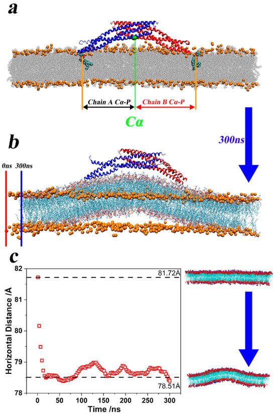 Following the completion of simulations, the Root Mean Square Deviation (RMSD) and Root Mean Square Fluctuation (RMSF) were computed to probe the comprehensive structural changes in the 4ATM BAR dimer during the membrane-bending process. As shown in Figure 1a,b, the RMSD exhibits a rapid increase within the first 25 ns, indicating that the 4ATM BAR dimer quickly transitions from its crystal structure in solution to a “functional configuration” on the membrane. Over the subsequent 275 ns, the RMSD increases gradually, yet remains relatively low, suggesting minimal structural changes in the BAR dimer during its interaction with the lipid membranes.