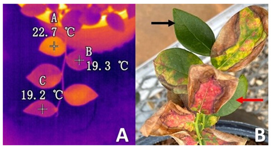 (A). Example of blueberry leaves displaying thermal symptoms typical of BLS leaves > 2 °C. (B). Leaves with thermal BLS symptoms may be asymptomatic (black arrow) or run a range of symptoms (an example diagnostic BLS leaf is indicated by the red arrow). These figures represent illustrative examples of the different leaf categories and not the actual stems used for testing.