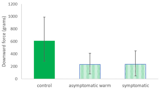 Mean (±st. dev.) downward force (grams) to dislodge leaves from uninfected (control) cultivar Emerald plants, Xf-infected plants with leaves that were visually asymptomatic but warm in thermal images (‘asymptomatic warm’), and Xf-infected plants with leaves that were visually diagnostic for BLS and also warm (‘symptomatic’). T-test results: asymptomatic vs. asymptomatic warm, n = 16 plants, t = 0.42, p = 0.68; control vs. asymptomatic warm, n = 16 plants, t = 8.5, p < 0.000001; control vs. symptomatic, n = 16 plants, t = 7.7, p < 0.000001. Bars with the same fill pattern did not statistically differ from each other according to the t-test results reported above.