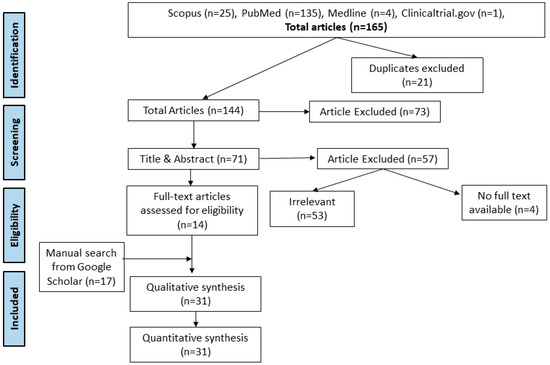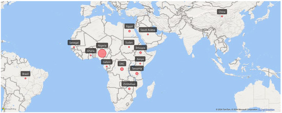 A comprehensive search of six electronic databases, including Scopus, PubMed, Medline, and ClinicalTrials.gov, resulted in the identification of 165 articles. After removing duplicates and screening titles and abstracts, 14 full-text articles were deemed eligible for inclusion. Additionally, a manual search on Google Scholar yielded 17 more articles, resulting in a total of 31 studies included in the quantitative synthesis (Figure 1) [43,44,45,46,47,48,49,50,51,52,53,54,55,56,57,58,59,60,61,62,63,64,65,66,67,68,69,70,71,72,73]. The Schistosoma species (S. haematobium, S. japonicum, S. mansoni, S. intercalatum, and S. haematobium—S. mansoni coinfection) were observed to be associated with various bacterial species, including Escherichia coli, Staphylococcus aureus, Klebsiella spp., Yersinia enterocolitica, Enterobacter aerogenes, Salmonella enterica, Pseudomonas aeruginosa, Salmonella typhi, Helicobacter pylori, and Citrobacter spp., among others. These bacterial species were isolated from blood, stool, urine, sputum, skin, and vaginal or cervical samples. Interestingly, Escherichia was isolated from 12 of the included studies [43,44,45,47,48,49,50,51,55,56,70,71], Klebsiella from 11 studies [43,44,45,47,48,49,50,51,55,70,71], Staphylococcus [43,47,48,49,51,56,70,71] and Salmonella [48,51,53,54,56,57,63,67] both from eight studies each, Pseudomonas from six studies [43,44,48,49,55,70], Proteus from five studies [43,48,49,50,70], and Streptococcus [44,49,56,70] and Mycobacterium [59,65,66,68] from four studies each. The rest of the bacterial isolates were reported in one or two studies. Most of the studies originated in Africa, where schistosomiasis remains endemic, with fewer studies conducted in Brazil, China, and Saudi Arabia. (Table 1, Figure 2). The geographical distribution of the included studies is shown in Figure 2, highlighting a significant concentration of research in African countries, reflecting the endemic nature of schistosomiasis in the region.