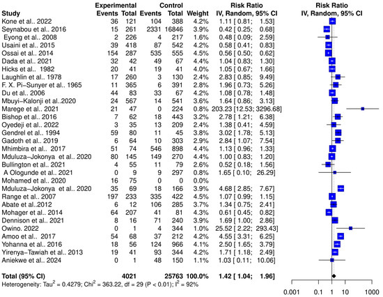 Forest plot showing the risk ratio of schistosomiasis and bacterial infections from 31 studies.