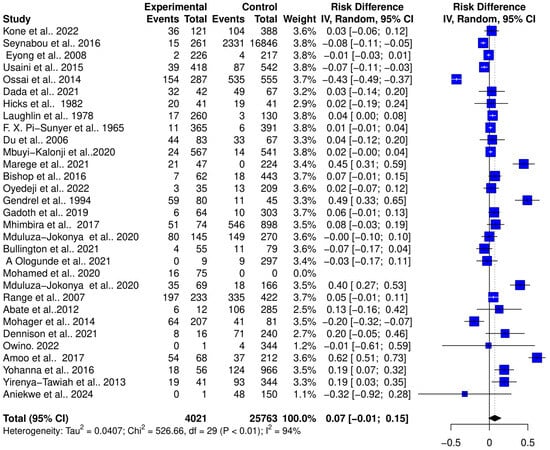 The interaction between schistosomiasis and the host microbiome was analyzed through a meta-analysis of 31 studies, comprising 29,784 observations and 5871 events. The pooled estimates indicated a significant association between schistosomiasis and changes in the microbiome of infected individuals. The relative risk (RR) for this association was found to be 1.42, with a 95% confidence interval (CI) of 1.04 to 1.96, yielding a statistically significant result (z/t = 2.27, p = 0.0307) under the random-effects model. This result suggests that individuals with schistosomiasis are 42% more likely to experience significant changes in their microbiome compared to those without the infection (Figure 3). The analysis revealed considerable heterogeneity in the interactions between schistosomiasis and the host microbiome, as evidenced by several statistical measures: τ2: 0.4279 (with a range from 0.2907 to 1.6277), which is an indicator of variance among the effect sizes; τ: 0.6541 (ranging from 0.5391 to 1.2758), representing the standard deviation of the true effect sizes; I2: 92.0% (with a range from 89.7% to 93.8%), indicating a high percentage of variability due to between-study differences rather than chance; H: 3.54 (ranging from 3.11 to 4.02), showing the ratio of total variability to within-study variability; and Cochran’s Q: 363.22, with a p-value of less than 0.0001, highlighting significant heterogeneity among the studies (Figure 3). This high level of heterogeneity indicates that the studies varied widely in their findings, suggesting that factors such as geographic location, population characteristics, Schistosoma species, praziquantel treatment, and gender or study methodologies could have influenced the outcomes. Additionally, the risk difference (RD) analysis across the pooled estimates did not show a significant change in the risk or proportion of interactions between schistosomiasis and the microbiome across the studies. The RD for the random-effects model was 0.0704 (95% CI, −0.0092 to 0.15), and the z/t value was 1.81 with a p-value of 0.0807, indicating that there was no statistically significant risk difference in the altered microbiome across the studies (Figure 4). The heterogeneity in the risk difference analysis was also significant, with τ2: 0.0407 (ranging from 0.0234 to 0.0756), τ: 0.2019 (ranging from 0.1531 to 0.2750), I2: 94.5% (ranging from 93.1% to 95.6%), H: 4.26 (ranging from 3.80 to 4.78), and Cochran’s Q: 526.66, with a p-value of less than 0.0001, further emphasizing the significant heterogeneity (Figure 4). The substantial heterogeneity (I2 = 94.5%) observed in the risk difference suggests that a large portion of the variability in the interaction between schistosomiasis and the microbiome cannot be solely attributed to sampling error but rather to true differences across the studies. The high levels of heterogeneity identified in both the relative risk and risk difference analyses imply that schistosomiasis and its impact on the microbiome are influenced by a variety of factors. These factors might include differences in environmental conditions, and local microbiome compositions could significantly affect how schistosomiasis interacts with the host microbiome; genetic diversity and differences in health status among populations could lead to varied responses to schistosomiasis; and differences in study design, data collection, and microbiome analysis techniques could contribute to the observed heterogeneity. Overall, the analysis highlights the complex and variable nature of schistosomiasis interactions with the host microbiome.