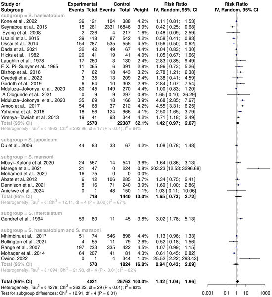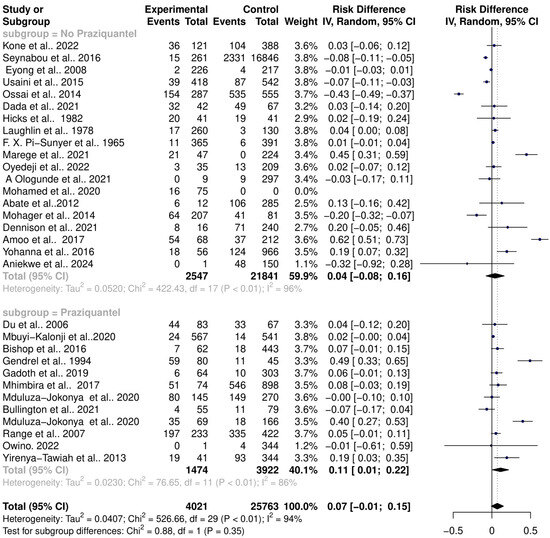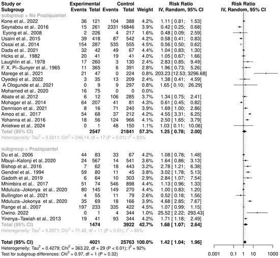 One of the cardinal side effects of praziquantel treatment is stomach aches and vomiting, suggesting possible disturbances of the intestinal microbiome. The effect of praziquantel treatment on schistosomiasis–host–microbiome interactions was assessed. The subgroup analysis showed that there is a significant risk change in the microbiome among Schistosoma-infected individuals in both praziquantel treatment (RR = 1.68, 95% CI = 1.07; 2.64) with high heterogeneity (Tau2 = 0.2971, Chi2 = 71.42, df = 11, p < 0.01); I2 = 85%) and non-praziquantel treatment (RR = 1.25, 95% CI = 0.78; 2.00) with high heterogeneity (Tau2 = 0.5011, Chi2 = 246.14, df = 17, p < 0.01); I2 = 93%). However, there was no significant difference among the subgroups (Chi2 = 0.91, df = 1, p = 0.32) (Figure 7).