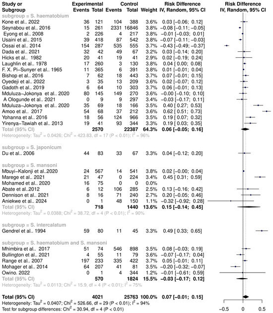 The pooled estimates of interactions between various Schistosoma species and the host microbiome indicate substantial variance across different study groups. This variance suggests that each Schistosoma species may uniquely interact with the host microbiome, contributing to the significantly high heterogeneity observed in the pooled datasets. To better understand these interactions, the datasets were subgrouped based on the specific Schistosoma species: S. haematobium, S. japonicum, S. mansoni, S. intercalatum, and S. haematobium-S. mansoni coinfection. This subgrouping allowed for a detailed assessment of the associations between individual Schistosoma species and their interactions with the host microbiome. A random-effects model was applied to analyze these subgroups, which revealed significant heterogeneity between the groups (Q = 12.91, df = 4, p = 0.0117). The RR and 95% CI for each subgroup were as follows: S. haematobium (k = 18, RR (95% CI) = 1.4188 (0.9732–2.0683)), S. japonicum (k = 1, RR (95% CI) = 1.0763 (0.7844–1.4769)), S. mansoni (k = 5, RR (95% CI) = 1.6496 (0.7324–3.7156), S. intercalatum (k = 1, RR (95% CI) = 3.0170 (1.7758–5.1260), S. haematobium-S. mansoni coinfection ((k = 5, RR (95% CI) = 0.9421 (0.4257–2.0850)). The subgroup analysis demonstrated that S. haematobium was the most significant contributor to the overall heterogeneity, accounting for 62.1% (τ2 = 0.4962, Chi2 = 292.96, df = 17, p < 0.01; I2 = 94%), S. mansoni contributed 13.0% (τ2 = 0, Chi2 = 12.11, df = 4, p = 0.02; I2 = 94%), and the coinfection of S. haematobium and S. mansoni accounted for 16.8% of the heterogeneity (τ2 = 0.1094, Chi2 = 21.98, df = 4, p < 0.01; I2 = 82%). This indicates that S. haematobium and its coinfection with S. mansoni are major factors contributing to the variability seen in the pooled analysis (Figure 5). Similarly, the analysis of risk differences among subgroups also highlighted significant heterogeneity between groups (Q = 30.94, df = 4, p < 0.0001). The risk difference (RD) and 95% confidence intervals for each subgroup were S. haematobium (k = 18, RD (95% CI) = 0.0571 (−0.0485–0.1626)), S. japonicum (k = 1, RD (95% CI) = 0.0376 (−0.1232–0.1984)), S. mansoni (k = 5, RD (95% CI) = 0.1547 (−0.1432–0.4527)), S. intercalatum (k = 1, RD (95% CI) = 0.4931 (0.3347–0.6514)), and S. haematobium and S. mansoni coinfection (k = 5, RD (95% CI) = −0.0263 (−0.1728–0.1202)) (Figure 6).