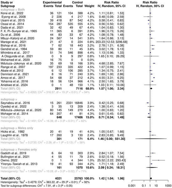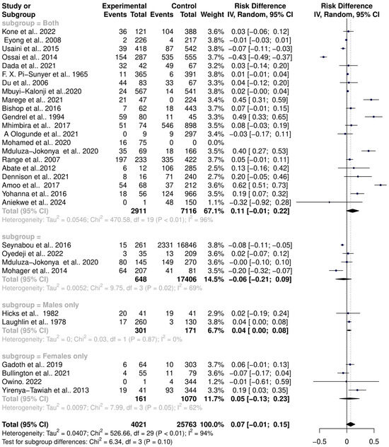 Gender significantly impacts human microbiota diversity and composition due to anatomical differences, hormonal influences, immune system differences, and behavioral and lifestyle factors. Females typically have a vaginal microbiome dominated by Lactobacillus species, while males have a urethral microbiome influenced by skin and gut-associated bacteria. These gender-specific differences play an important role in schistosomiasis interactions with the host microbiome, such as bacterial vaginosis and urogenital infections. A gender subgroup analysis revealed that studies not differentiating between males and females showed a higher risk of Schistosoma infections altering the microbiota (RR = 1.57, 95% CI = 1.06; 2.34) with high heterogeneity (Tau2 = 0.4265, Chi2 = 316.57, df = 19, p < 0.01, I2 = 94%). Conversely, studies not reporting on gender recorded lower risks of schistosomiasis altering the host microbiota (RR = 0.71, 95% CI = 0.34; 1.49) with significant heterogeneity (Tau2 = 0.1491, Chi2 = 16.39, df = 3, p < 0.01, I2 = 82%). Further analysis showed that Schistosoma infections in males have a higher risk of altering the host microbiome (RR = 1.46, 95% CI = 0.00; 551.30) with high heterogeneity (Tau2 = 0.2730, Chi2 = 2.26, df = 1, p = 0.13, I2 = 56%). In females, the risk is even higher (RR = 2.09, 95% CI = 0.24; 18.31) with high heterogeneity (Tau2 = 1.0486, Chi2 = 10.28, df = 3, p = 0.02, I2 = 71%) (Figure 9). The risk difference (RD) for the random-effects model varied; studies not differentiating between genders showed RD = 0.11 (95% CI = −0.01; 0.22), studies not reporting on gender showed RD = −0.06 (95% CI = −0.21; 0.09), male-specific studies showed RD = 0.04 (95% CI = 0.00; 0.08), and female-specific studies showed RD = 0.05 (95% CI = −0.13; 0.23) (Figure 10). This indicates gender differences in microbiome diversity are altered by schistosomiasis.