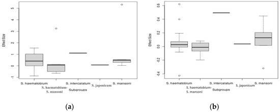 Boxplot showing the effect size distribution of Schistosoma species among schistosomiasis and bacterial coinfection; (a) effect size calculation from risk ratio, (b) effect size calculation from risk difference.