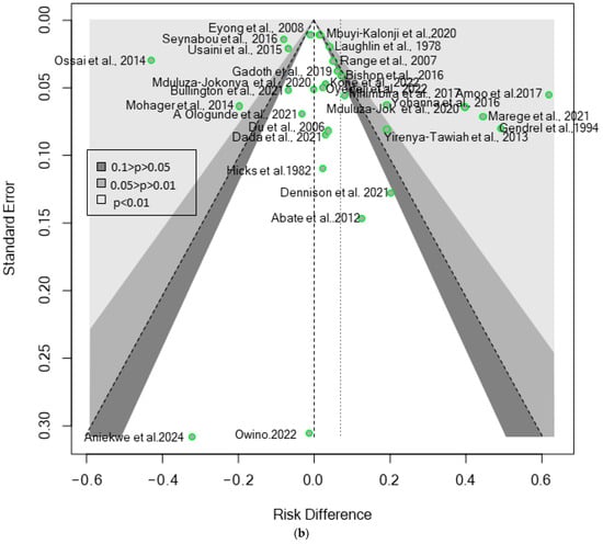 Funnel plot (Trim and Fill) showing asymmetrical distribution for schistosomiasis and bacterial infection from the 31 studies; (a) assess publication bias based on risk ratio analysis, (b) assess publication bias based on risk difference analysis.
