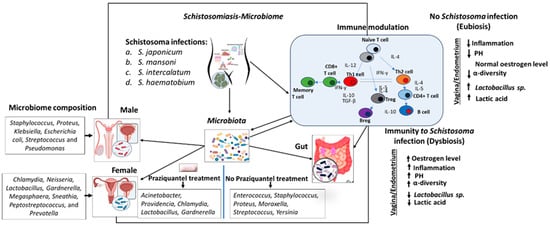 Schistosomiasis itself can disrupt the balance of microbial communities, leading to dysbiosis. The immune response to Schistosoma and the resulting inflammation can alter the microbiome, often reducing the abundance of beneficial bacteria and allowing opportunistic or pathogenic microbes to flourish [153]. For instance, specific bacterial species such as Staphylococcus, Proteus, Klebsiella, Escherichia coli, Streptococcus, and Pseudomonas have been observed in Schistosoma-infected males, while females often harbor Chlamydia, Neisseria, Lactobacillus, Gardnerella, Megasphaera, Sneathia, Peptostreptococcus, and Prevotella [97,154]. Treatment with praziquantel, the only drug currently effective for schistosomiasis, can also influence microbiota composition, with shifts in species like Acinetobacter, Providencia, Chlamydia, Lactobacillus, and Gardnerella compared to untreated individuals, where different species such as Enterococcus, Staphylococcus, Proteus, Moraxella, Streptococcus, and Yersinia predominate [28].