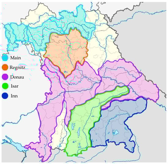 The investigated A. salmonicida subspecies salmonicida isolates were collected from symptomatic Alsatian char, Brook trout (Salvelinus alpinus × fontinalis), Arctic char, Brown trout, Rainbow trout and Danube salmon specimens during disease outbreaks presenting with clinical symptoms typical for furunculosis. The samples were collected from several aquaculture establishments in the region of Bavaria, Germany, between 2017 and 2020. Sampling locations were located within watersheds of the Danube, Regen, Inn, Isar and Main as adjacent rivers (Figure 1). The fish samples were delivered to the Bavarian Animal Health Service, Fish Health Service division (Tiergesundheitsdienst Bayern e.V./Fischgesundheitsdienst, Poing, Germany) as a part of a routine laboratory diagnosis/investigation of clinical cases reported by the fish farmers. The initial analysis of the taxonomical status of collected isolates, proving their status as Aeromonas salmonicida subsp. salmonicida, was performed by Bavarian Animal Health Service, Fish Health Service division, with MALDI-TOF analysis.