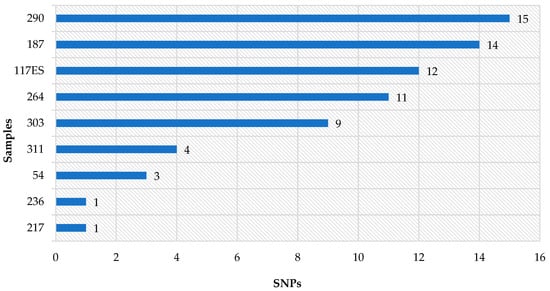 In the case of SNPs, tested samples were characterized by values from 0 to 15. The highest level was detected in samples 290-1; 187-1, 254-1 and 117ES-1 (10–15 SNPs); the rest of the samples had four or fewer SNPs (Figure 3).