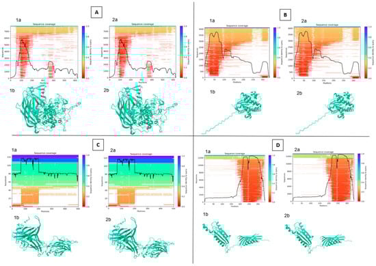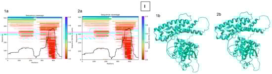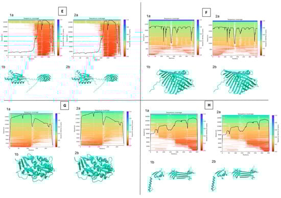 Protein structure analysis between reference and selected sample (290-1) [(A)—ASA_2540; (B)—ASA_ 0509; (C)—ASA_1438; (D)—ASA_1267; (E)—OmpA; (F)—OmpC; (G)—OmpF; (H)—AscC; (I)—AexT; a—sequencing coverage; b—3D structure; 1—sample; 2—reference] (analysis was performed using Neurosnap platform and Alphafold 2 model).