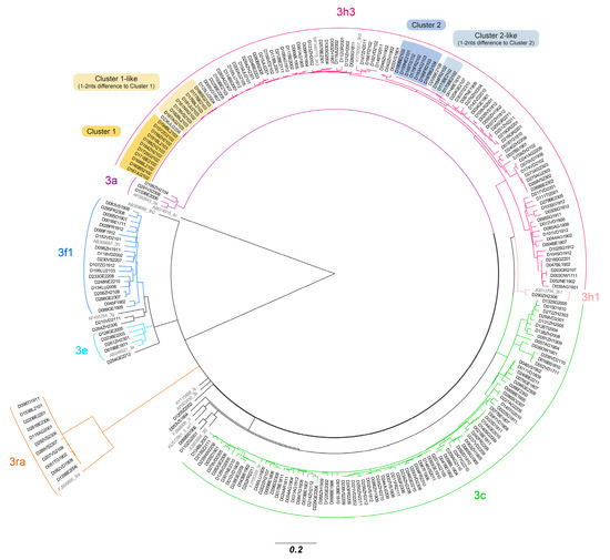 The Swiss reference laboratory for infectious disease markers analysed all positive blood donor HEV cases for confirmation and sequenced part of the viral genome. Viral load determinations revealed HEV titres that ranged from 1 IU/mL to 6 × 106 IU/mL, with 55% of all cases having titres below 103 IU/mL (Table 3). The median titre was calculated to be 717 IU/mL. Sequencing a fragment of the ORF2 allowed for the determination of the HEV genotype in 235 cases []. All of these were of genotype 3: 109 were caused by the Swiss-endemic HEV genotype 3h3 (49%) [], 79 by 3c (33%), 18 by 3f1 (8%) and 11 by 3ra (5%) (Table 4). Genotype 3h3 was solely responsible for all the HEV cases detected during the outbreak from January to May 2021. A number of 312-nucleotide-long sequences of ORF2 were analysed using different reference strains and a phylogenetic tree was constructed. The results show that the cases of the outbreak form two distinct 3h3 clusters, with sub-clusters that differ in but 1–2 nucleotides (Figure 2).