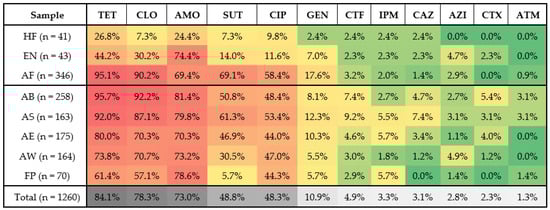 Percentage of resistance to different antibiotics of Escherichia coli isolates obtained from different collection points in a swine slaughterhouse in São Paulo state, Brazil. Red represents the highest percentages, green represents the lowest, and yellow represents the range between them. AB: after bleeding, AS: after scalding; AE: after evisceration; AW: after final washing; AF: animal feces; FP: final products; EQ: equipment; EN: environment; HF: human feces; AMO: amoxicillin; CTF: ceftiofur; CAZ: ceftazidime; CTX: cefotaxime; IPM: imipenem; ATM: aztreonam; GEN: gentamicin; TET: tetracycline; CIP: ciprofloxacin; SUT: sulfamethoxazole with trimethoprim; CLO: chloramphenicol; AZI: azithromycin.