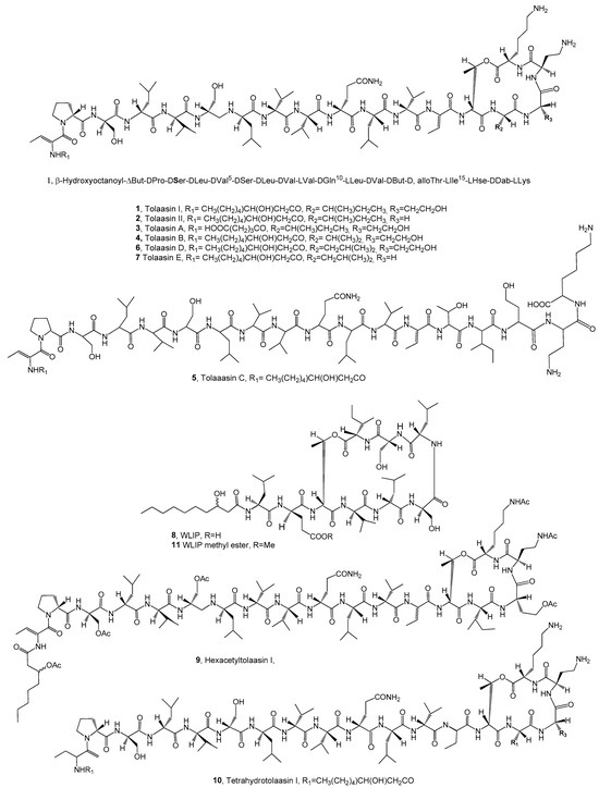| Tolaasin II (2) | ″ | Bacillus megaterium and Rodococcus fascians | [31] |