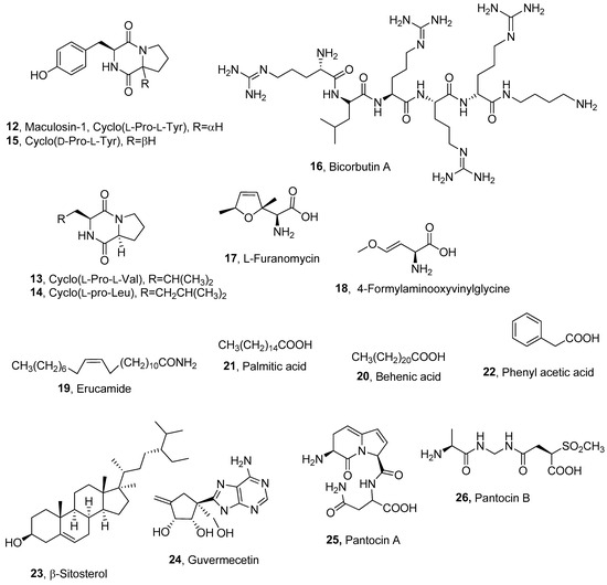 Erucamide, behenic, palmitic, phenylacetic acids and β-sitosterol (19–23, Figure 1, Table 1), were purified from the organic extract of B. megaterium and their activity was tested against Agrobacterium tumefaciens T-37, E. carotovora EC-1 and Ralstonia solanacearum RS-2. Palmitic acid (21) had no antibacterial activity (>500 µg/mL), while erucamide (19) showed moderate antibacterial activity (MIC 500 µg/mL). Behenic acid (20) was active with MICs of 250 µg/mL against T-37 and RS-2 strains while β-sitosterol (23) showed significant activity against RS-2. (MIC of 15.6 µg/mL). Phenylacetic acid (22) exhibited activity towards all the three strains T-37 and against EC-1 and RS-2 (with a MIC of 62.5, 125, 15.6 µg/mL, respectively) and showed potential for their biocontrol [52].