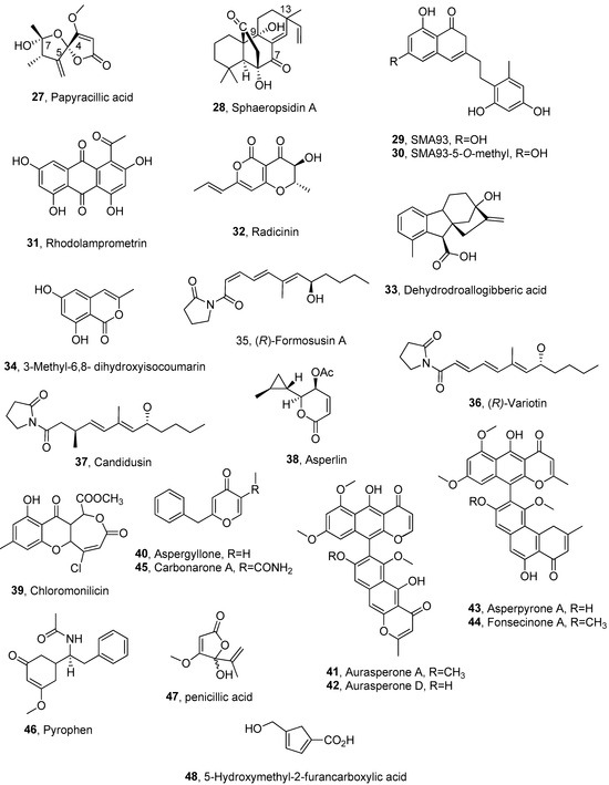 Aspergyllone A (40, Figure 2, Table 2), a new 6-benzyl-γ-pyrone, was isolated together with the aurasperones A and D, asperpyrone A, fonsecinone A, carbonarone A and pyrophen (41–46, Figure 2, Table 2) from the culture filtrates of an endolichenic fungus Aspergillus niger Tiegh [69]. The fungus was collected from lichen thallus Parmotrema ravum (Krog and Swinscow) Serus, in India. All the compounds were assayed for their antimicrobial activity and aspergyllone (40) showed strong selective antifungal activity against Candida parapsilosis (IC50 of 52 mg/mL) and carbonarone A (45) exhibited activity against Candida albicans and Candida krusei (IC50 (inhibitory concentration, 50%) 103 mg/mL and 31 mg/mL, respectively). Compound 45 also showed significant activity against a plant pathogenic bacterium, Dickeya solani (IC50 88 mg/mL), which is the causal agent of blackleg and slow wilt symptoms of potato plants in a number of European countries and Israel [70]. Aurasperone A (41) displayed antibacterial activity against Pseudomonas aeruginosa and S. aureus (IC50 of 160 mg/mL and 135 mg/mL, respectively) and anti-candidal activity only towards C. krusei (IC50 of 373 mg/mL). Fonsecinone A (44) inhibited only S. aureus and E. coli (IC50 of 120 mg/mL and 47 mg/mL, respectively) and the plant pathogen, Pseudomonas syringae pv. maculicola McCulloch with IC50 of 154 mg/mL. P. s. pv. maculicola caused leaf spot and blight diseases of crucifer crops worldwide [71]. Asperpyrone A (43) exhibited antibacterial activity against E. coli, with an IC50 value of 112 mg/mL. Pyrophen (46) demonstrated promising antimicrobial properties, inhibiting 50% of the tested organisms, including humans, fish and foodborne pathogens. It exhibited antifungal activity against various Candida species, except C. krusei. Furthermore, significant antibacterial activity was observed against Micrococcus luteus (IC50 63 mg/mL), Aeromonas hydrophila (IC50 78 mg/mL) and Listeria innocua (IC50 86 mg/mL). In contrast, Aurasperone D (42) showed no antimicrobial activity [69]. Penicillic acid (47, Figure 2, Table 2) was isolated from Penicillium sp. CRM 1540 obtained from Antarctic marine sediment as a potential bioinsecticide against Xanthomonas citri subsp. citri, which is the causal agent of citrus canker. When tested in vitro assays against X.campestris and X. citri subsp. citri, penicillic acid (47) showed MIC for 90% growth inhibition of the bacterial cells of 49.39 and 25.0 µg/mL, respectively. In greenhouse experiments, penicillic acid (25 µg/mL) suppressed citrus canker development by 75.31% [72].