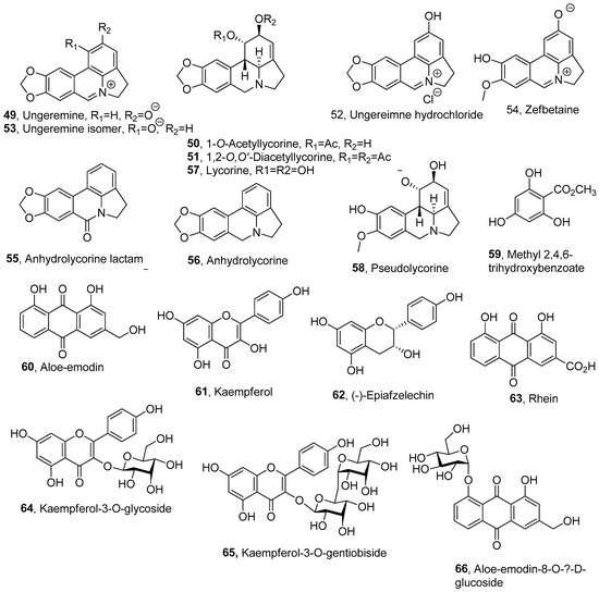 | Ungeremine (49) | Pancratium maritimum | Edwardsiella ictaluri, Flavobacterium columnare | [80] |