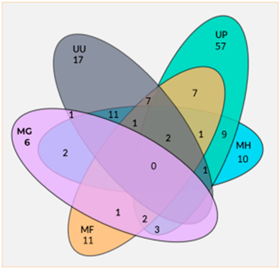 Co-infection numbers of several Mycoplasma spp. UU = Ureaplasma urealyticum; UP = Ureaplasma parvum; MH = Mycoplasma hominis; MG = Mycoplasma genitalium; MF = Mycoplasma fermentans.