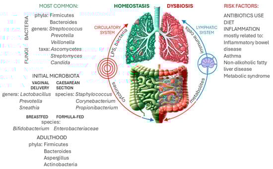Traditionally, the intestine has been regarded primarily as a digestive organ, while the lungs are considered to be responsible for gas exchange and respiratory functions [1]. However, emerging evidence reveals a complex, bidirectional communication network between these systems, referred to as the gut–lung axis, which may significantly impact the function and health of both the gut and the respiratory system [2]. This connection suggests that the intestinal microbiota, which plays an essential role in metabolic processes and immune system regulation, might also influence respiratory health. The microbial communities in the gut coexist symbiotically with their host, utilizing available nutrients to perform critical tasks such as fermenting food components to produce metabolites, vitamins, and minerals. For instance, short-chain fatty acids (SCFAs) like lactic acid and butyric acid, produced through fermentation, serve as an energy source for large intestinal epithelial cells [3,4]. Gut bacteria also affect hepatic fat metabolism, indirectly influencing cholesterol and fatty acid transformation, while contributing to essential B vitamins and vitamin K synthesis [3]. Beyond these metabolic roles, the gut microbiota is integral to immune function, promoting the growth and maturation of immune cells through microbial sensing and providing local and systemic signals that help shape immune responses [5,6,7,8,9]. Through competition for habitat and nutrients and bacteriocin production, beneficial microbes prevent pathogenic bacteria from thriving and thereby support tissue homeostasis.