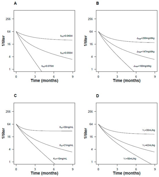 Antibody recycling model: effect of changing model parameters. (A) Increasing the fractional intrinsic catabolic rate () increased the rate of elimination. (B) Increasing the maximum recycling rate () reduced the elimination rate, and resulted in substantial deviation from linear (first-order) elimination kinetics. (C) Effect of changing the Michaelis–Menten constant (). (D) Effect of changing the distribution volume ().