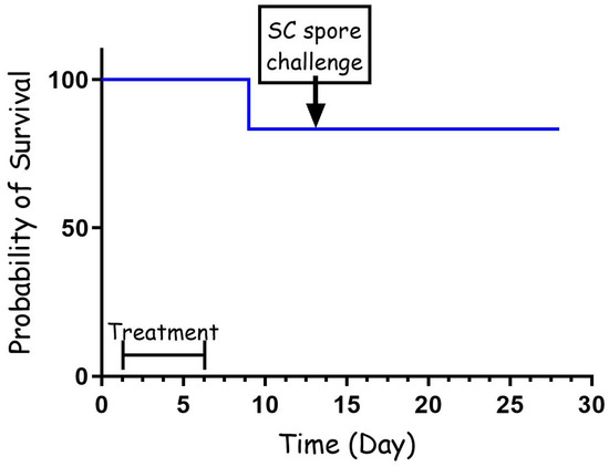 PEP treatment (30 mg/kg) with cefazolin following IN spore instillation of B. anthracis Vollum strain. Eight rabbits were sedated and infected IN with spores. Treatment was initiated 24 h post-infection, SC, with 30 mg/kg of cefazolin, twice a day. The treatment duration is marked by a vertical arrow, and the SC spore challenge is marked with a horizontal arrow. Survival is presented as a Kaplan–Meier curve.