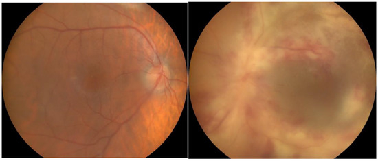 - Jabs, D.A.; Belfort, R.; Bodaghi, B.; Graham, E.; Holland, G.N.; Lightman, S.L.; Oden, N.; Palestine, A.G.; Smith, J.R.; Thorne, J.E.; et al. Classification Criteria for Cytomegalovirus Retinitis. Am. J. Ophthalmol. 2021, 228, 245–254. [Google Scholar] [CrossRef]