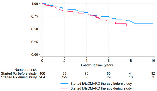 However, many patients changed their b/tsDMARD during the study period. At the conclusion of the study period, adalimumab was the treatment for 57/310 (18%), tocilizumab for 46/310 (15%), etanercept for 42/310 (14%), rituximab for 41/310 (13%), golimumab for 18/310 (6%), certolizumab for 14/310 (5%), abatacept for 10/310 (3%), tofacitinib for 9/310 (3%), baricitinib for 2/310 (0.7%), and infliximab for 2/310 (0.6%). b/tsDMARDs were ceased in 37/310 (12%) and there were 32/310 (10%) who had moved to a different location/prescriber or who were lost to follow-up during the study period.