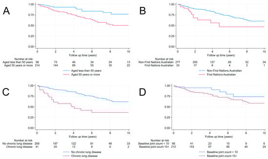 Time to first serious infection between October 2012 and October 2021, stratified by the factors that were most associated with the development of infection. (A): Age; (B): First Nations Australian status; (C): Underling lung disease; (D): Joint count at the initiation of b/tsDMARD therapy.