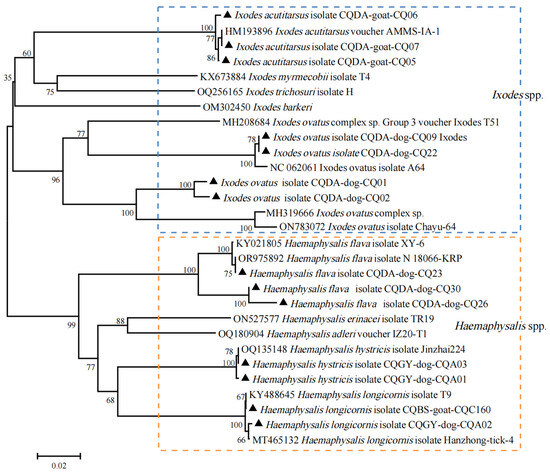 Phylogenetic analysis of ticks based on the nucleotide sequences of COI. Sequences obtained in this study are marked with black triangles before their names.