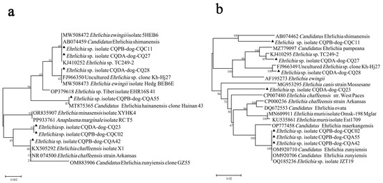 Ehrlichia sp. was detected in seven (1.16%) ticks based on the genetic sequences of 16S rRNA and groEL. The 16S rRNA and groEL gene sequences of the strains (CQPB-dog-CQC11, CQDA-dog-CQ27, CQPB-dog-CQA55, CQPB-dog-CQC02, and CQPB-dog-CQA42) showed 99.12–100.00% identity to diverse Ehrlichia species in GenBank. These strains were identified as unspecific Ehrlichia sp. Strain CQDA-dog-CQ23 showed the highest identity, at 99.53% (Query cover: 100%, E-value: 0.0) and 94.42% (Query cover: 100%, E-value: 0.0), to the 16S rRNA and groEL genes of E. chaffeensis str. Arkansas, respectively. Another strain, CQDA-dog-CQ28, showed the highest identity, at 100.00% (Query cover: 100%, E-value: 0.0) and 94.41% (Query cover: 100%, E-value: 0.0), to the 16S rRNA and groEL genes of uncultured Ehrlichia sp. clone Kh-Hj27 from Russia, respectively (Figure 4, Table S3).