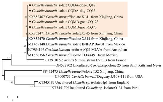 I. ovatus, Ha. flava, and Ha. longicornis were confirmed to harbor Co. burnetii, with positive strains detected in eight (1.83%) ticks from Dongan and Miaoba. These IS1111-positive sequences were identical to those obtained from the previous strains and clustered together with Co. burnetii, as reported in Xinjiang, in a phylogenetic tree (Figure 5).
