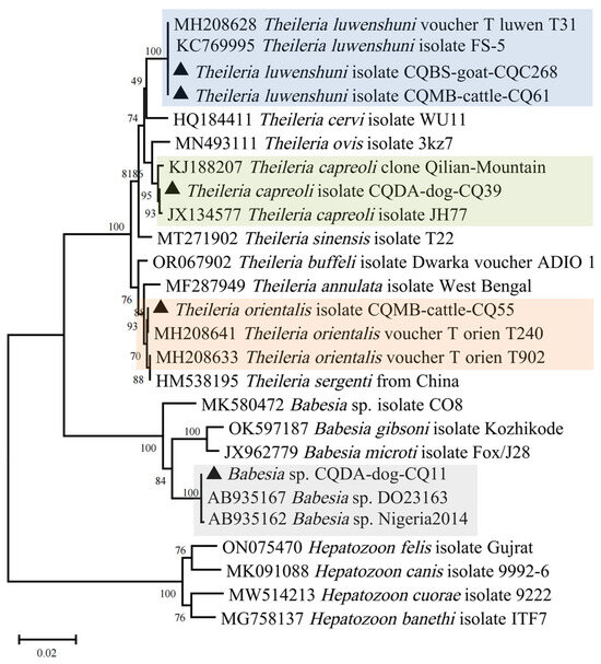 Primers based on the 18S rRNA gene for Babesia spp., Theileria spp., and Hepatozoon spp. were used in this study [29]. Babesia sp. was detected in one Ha. flava tick (0.17%) which was sorted in the same cluster as Babesia sp. from Japan (AB935167) (Figure 6), with identical 18S rRNA gene sequences. In addition, three Theileria species were detected in Chongqing, including T. capreoli (0.17%), T. orientalis (0.17%), and T. luwenshuni (3.00%). T. luwenshuni, detected in ticks from goats and cattle, was the dominant protozoan in Dongan, Miaoba, Gaoyan, and Bashan. A Ha. flava collected from a dog in Dongan was found to be infected with T. capreoli. Its 18S rRNA gene showed 99.93% identity with that detected in the blood of a white-lipped deer (JX134577). T. orientalis was carried by a Ha. longicornis collected from cattle in Miaoba, with an identical 18S rRNA gene sequence to that of T. orientalis isolated in Rhipicephalus microplus (MH208641).