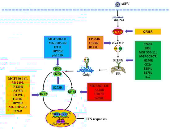 The innate immune system serves as the initial barrier of defense for the host against invading pathogens []. The presence of aberrant nucleic acids in the cytoplasm will be sensed by the innate immune system, which triggers a response from type I interferon (IFN-I) []. Cyclic guanosine monophosphate-adenosine monophosphate synthase (cGAS) detects cytoplasmic microbial DNA and endogenous DNA resulting from genomic instability, thereby initiating innate immunity and playing pivotal roles in antiviral defense as well as the pathogenesis of various diseases []. Upon dsDNA binding, cGAS produces 2′3′-cyclic-GMP-AMP (2′3′-cGAMP), a second messenger that binds to the ER resident stimulator of interferon genes (STING) to induce innate immune responses []. Upon binding 2′3′-cGAMP, STING undergoes translocation from the ER to the endoplasmic reticulum–Golgi intermediate compartment (ERGIC) and subsequently to the Golgi apparatus, which is reliant on the COP-II complex and ARF GTPases []. The trans-Golgi network (TGN) serves as a site where STING recruits and activates TANK-binding kinase 1 (TBK1), subsequently leading to the activation and nuclear translocation of interferon regulatory factor 3 (IRF3) and nuclear factor kappa B (NF-κB) []. The cGAS-STING DNA sensing pathway has been found to have a crucial function in stimulating IFN-I and inhibiting the replication of viruses, specifically for DNA viruses []. After internalization, the nucleic acid of ASFV is primarily detected by the cytoplasmic DNA sensor cGAS []. To evade the host’s innate immune response, ASFV produces numerous proteins that hinder the generation of IFN-I by counteracting the cGAS-STING signaling pathway through protein–protein interactions []. The past decade has witnessed numerous studies demonstrating the involvement of multiple proteins from ASFV in facilitating viral replication through protein–protein interactions with host factors during ASFV infection [,]. The objective of this article is to provide a comprehensive overview of the strategies employed by ASFV to impede the cGAS-STING pathway.