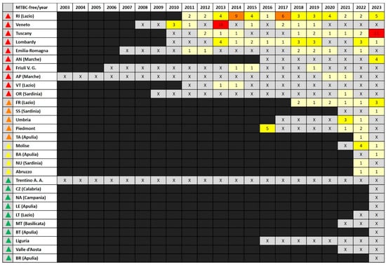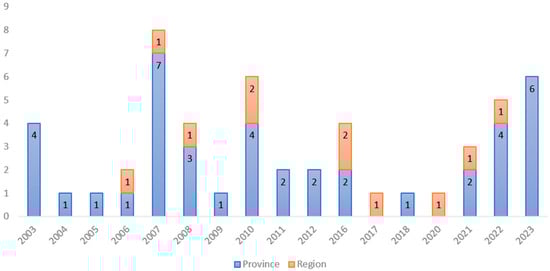 Overall, 19 EU regulations regarding the approval or withdrawal of MTBC-free status in Italian territories were found, issued from 2003 to 2023, with a four-year gap in 2012–2015 (Table S1). The Italian territories can be assumed as the zones defined in the AHL [19] as “areas of a Member State [..] with a precise geographical delimitation, containing an animal subpopulation with a distinct health status with respect to a specific disease or specific diseases subject to appropriate surveillance, disease control and biosecurity measures”, and coincide with regions and provinces. The Trentino-Alto Adige region (divided in the autonomous provinces of Trento and Bolzano) was declared as an FT before 2003 [32]; therefore, a total of 12 regions are now FTs. By consulting these regulations, 11 regions and 41 provinces had acquired the MTBC-free status in the aforementioned period. Overall, the highest number of territories acquired the MTBC-free status in 2007 (one region and seven provinces), with an increasing trend in the last two years (2022, 2023), with five and six FT added, respectively (one region and ten provinces) (Figure 1).
